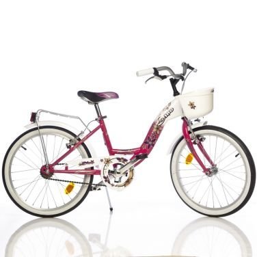 Bici Dino 20" con telaio Hig Ten TIG, f-cella rigida, ruote alluminio, gruppo freni V-brake in alluminio, cestino e p-tapacchi posteri-e con fanale. Altezza indicativa del bambino per questo articolo: da 135 a 145 cm.
